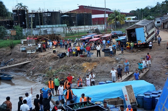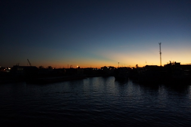 Kurz vor fünf werde ich richtig wach. Vom Steuerhaus her ertönt Musik. Ans Wieder-Einschlafen ist nicht mehr zu denken. Das Schiff legt an. Also stehe ich auf und begebe mich nach draussen. Da werden schon wieder Waren umgeschlagen. Es ist sagenhaft, was die Verlademanschaft in kürzester Zeit schafft. Es werden Getränkeflaschen, zu sechst oder mehr in Plastik verschweisst, hinausgetragen. Die Burschen nehmen drei bis fünf Packkungen auf einmal auf ihren Buckel und tragen sie nur in Flip-Flops oder sogar barfuss über ein Brett mit ein paar senkrecht dazu aufgenagelten Leisten an Land.