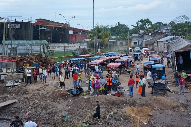 Das Abendessen ist heute im Restaurant Al Frio y Al Fuego vorgesehen. Doch es kommt anders. Als wir um ca. 19 Uhr an Beatrice’ Zimmertüre klopfen, klagt sie über Unwohlsein. Also machen wir uns halt zu zweit auf den Weg und halten ein Mototaxi an. Damit fahren wir zur Übersetzstelle, denn das schwimmende Restaurant befindet sich mitten in einem See, der durch den Rio Itaya vor seiner Einmündung in den Amazonas gebildet wird. Aber dort werden wir abgewiesen, da das Lokal sonntags nicht so lange geöffnet habe. Also lassen wir uns zum Boulevard führen und nehmen unser Abendessen auf der Terrasse des La Noche ein, wie am zweiten Abend in Iquitos. Darauf geniessen wir das laute und lebensfreudige Treiben auf dem Boulevard und auf der Plaza de Armas, bevor wir uns von einem Mototaxi zum Hotel zurückführen lassen.