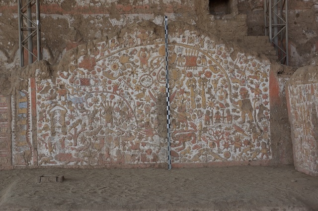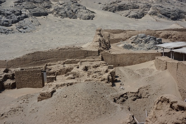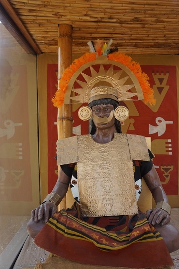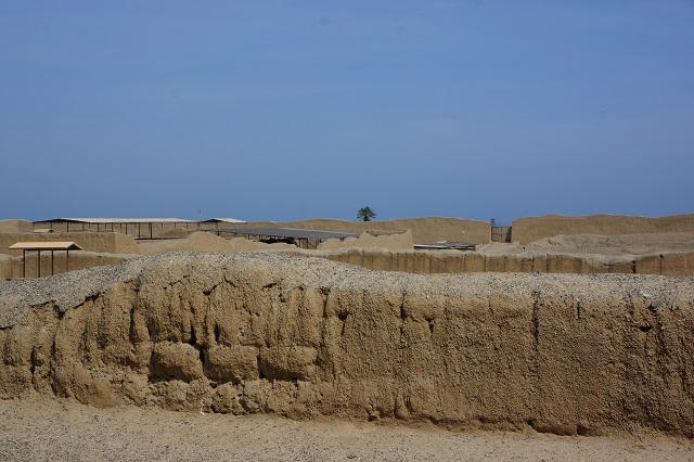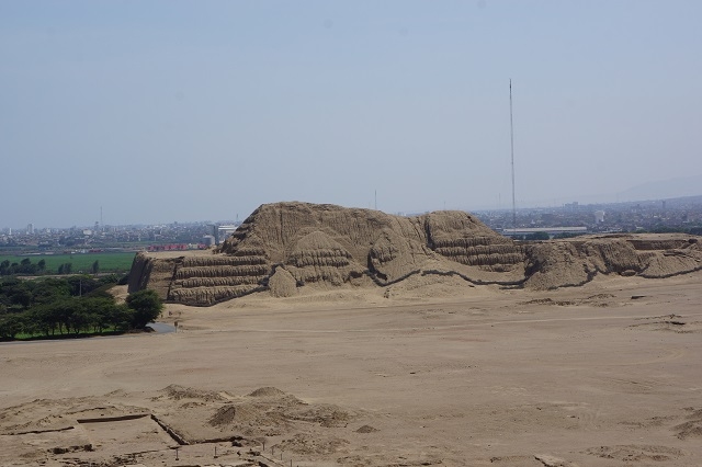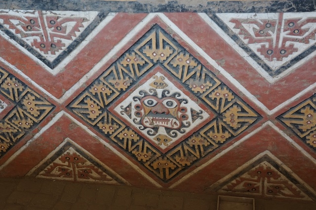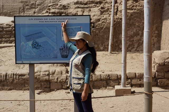 Zwei ungeordnete Haufen erheben sich in der umgebenden Wüste. Beim einen Haufen sind Überdachungen aus Wellblech und anderern Materialien sichtbar. Was erwartet uns wohl hier? Unser Chauffeur führt uns zu einem Parkplatz mit niedrigen Gebäuden. Wir steigen aus, bekommen aber von einem Parkplatzwärter mitgeteilt, dass wir Eintrittstickets kaufen müssten und dass diese bei den Gebäuden ein paar hundert Meter weiter südlich gekauft werden können. Also fahren wir zurück und besorgen uns die Tickets. Damit kommen wir problemlos aufs Gelände. Wir müssen noch etwas warten, bis genügend Besucher zusammen sind für eine Führung. Eine Guia begleitet uns mit erklärenden Worten durch den fantastisch anmutenden Komplex. Sie spricht deutlich und langsam spanisch, so dass wir doch das eine und andere an Informationen mitbekommen. Wir befinden uns in der Huaca de la Luna (Mondpyramide). Und wir sind erstaunt, was sie uns alles über die hier ab ca. 500 n. Chr. herrschende Moche-Kultur erzählt, und was wir hier an Bauten und ihrer Ausgestaltung zu sehen bekommen. Nicht weit davon erhebt sich die Huaca del Sol, die im Gegensatz zum besuchten Ort noch wenig erforscht ist.