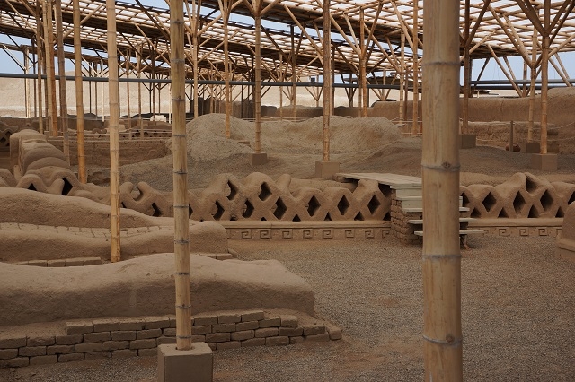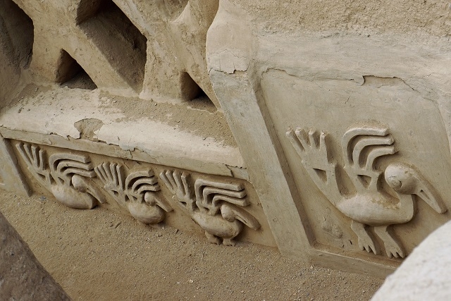 Als wir auf den Parkplatz zurückkommen, werden wir von einem Wärter erwartet. Er reicht uns einem anderen Taxifahrer weiter, da der vorherige mit seinem gelben Taxi nur im Stadtgebiet herumfahren dürfe. So jedenfalls haben wir ihn verstanden. Mit dem neuen Fahrer geht es nun nach Chan Chan, der Hauptstadt des Chimú-Reiches weiter. Sie ist wie schon die beiden besuchten Pyramiden vollständig aus ungebrannten Lehmziegeln erbaut und gilt mit mehr als 20 km2 Fläche und rund 100 000 Einwohnern im 12./13. Jahrhundert als grösste prähistorische Stadt Südamerikas. Wir können nur den Tschudikomplex der Ausgrabungsstätte besuchen und sind wiederum sehr beeindruckt von den Bauwerken und den verschiedenen Ornamenten, die verwendet wurden.