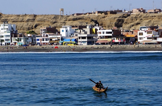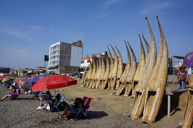 Nun steht uns noch der gemütliche Teil unseres Ausflugs bevor. Wir lassen uns an die Pazifikküste nach Huanchaco führen, entlassen dort den Taxifahrer und sehen uns noch etwas in diesem Badeort um. Berühmt soll er sein, weil hier noch die historischen Binsenboote verwendet werden. So sehen wir vereinzelte dieser Wassergefährte in Aktion. Der Grossteil aber steht zum Trocknen aufgestellt am Strand. Dafür ist aber eine Unmenge von Wellensurfern im Wasser. Mit grösserem und geringerem Können warten sie die hohen Wellen ab, stellen sich zum richtigen Zeitpunkt auf ihr Brett und lassen sich auf den Wellen stehend Richtung Küste treiben, ein eindrückliches Schauspiel.