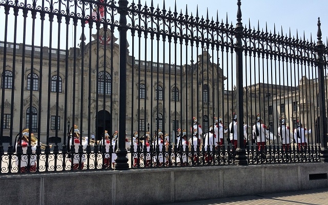 Nach der Dusche gehen wir zu dritt auf die Plaza de Armas, wir kommen gerade rechtzeitig zu einer Galavorführung des Militärblasorchesters. Vor dem Regierungspalast marschiert das Musikcorps in streng geordneter Weise auf und bietet den Zuschauern ein hochstehendes Konzert. Ein Wermutstropfen dabei ist, dass zwischen Publikum und Kapelle ein hoher schmiedeeiserner Hag steht und zudem das ganze Trottoir von Sicherheitsleuten abgesperrt wird. Dafür ist während des Konzerts die Strasse verkehrsfrei.