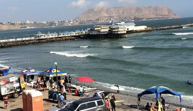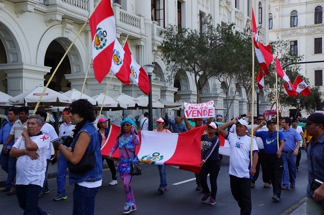 Wir spazieren gemütlich auf dem Jiron de la Union zur Plaza San Martin. Was ist denn da los? Lautes, anfeuerndes Rufen ist hörbar. Am Ende der Strasse, bei der Einmündung auf den Platz, stehen dicht nebeneinander rund zehn Polizisten mit Helmen auf, einen durchsichtigen, mannshohen Schild vor sich, mit dem Rücken zu uns. Auf der Strasse rund um den Pllatz werden jetzt fahnen-, plakat- und spruchbändertragende Menschen sichtbar, die lauthals protestieren. Wir nähern uns Ihnen, um mitzubekommen, worum es geht. Die Plakate und selbstgemalten Bänder sind gegen Bohr- und Ausbeutungsrechte in der Provinz Loreto gerichtet, die von staatlichen Amtsstellrn offenbar ziemlich freizügig vergeben werden. Die Menschen werden aufgerufen, sich für die Anliegen Loretos einzusetzen und ihre Lebensgrundlage, die Natur, zu schützen. Nachdem die Protestierenden den Platz zweimal umrundet haben, eine lange Auto- und Motorradkolonne hinter sich her ziehend, schwenken sie zur Mitte des Platzes ein und versammeln sich dort. Wir verlassen die Szene und fahren mit einem Taxi zum Larcomar im Stadtteil Mirasoles.