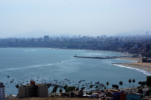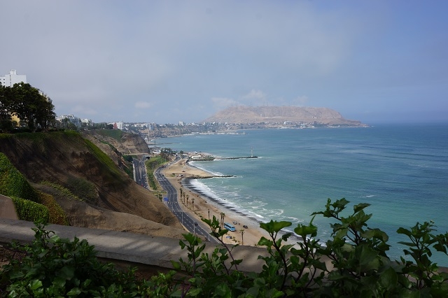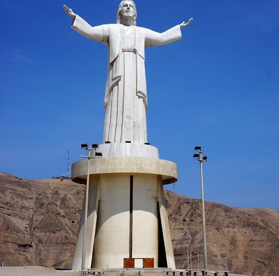 Alex soll sich laut Beatrice immer in diesem Bereich der Stadt aufhalten, um als frei schaffender Taxifahrer Kunden anzuwerben. Sie braucht nicht lange nachzufragen. Schon der zweite Angesprochene ruft ihr Alex per Handy herbei. Und er hat auch gleich ein Angebot bereit, um mit uns ins Geschäft zu kommen. Er schlägt uns vor, uns zu der grossen Christustatue, die weithin auf einem nahen Hügel zu sehen ist, zu fahren. Wir machen mit ihm den Preis ab, gehen noch einen Kaffee trinken bzw. ein Eis essen und steigen dann zu ihm ins Taxi. Er führt uns auf den vorgesehenen Aussichtspunkt, nicht ohne einen Zwischenhalt zum Fotografieren am Meer zu machen. Bei der Christustatue angekommen, erklärt er uns auch, dass er öfter hierher komme, um nachzudenken. Hier, an diesem Ort Limas, könne man hören, was in der ganzen riesigen, rund zehn Millionen Einwohner zählenden Stadt abgehe. Wir verbringen einige Zeit an diesem wirklich spektakulären Ort, fotografieren, machen uns gegenseitig auf Dinge aufmerksam, die von hier aus zu sehen sind, und staunen. Rund um Lima erstreckt sich die Wüste. An den Hängen kleben bis weit hinauf die Bretter- und Blechbuden der Ärmsten. Unten in den Strassen, zwischen modernen Hochhäusern, teilweise heruntergekommenen Ruinen und Baustellen pulsiert der laute Verkehr. Wir besuchen auf demselben Hügelzug noch das nachts weit herum sichtbare, beleuchtete Papstkreuz und eine sehr gepflegte Marienkapelle, die zur Erinnerung an den Besuch des Papstes Juan XXIII 1998 erstellt wurde. Dann fährt uns Alex zur Rosa Nautica. Wir verabschieden uns von ihm mit der Abmachung, dass er uns um halb vier beim Parque Kennedy abhole, um uns dann mit einem Umweg übers Hotel, wo unser Reisegepäck noch auf uns wartet, zum Flugplatz zu bringen.