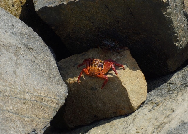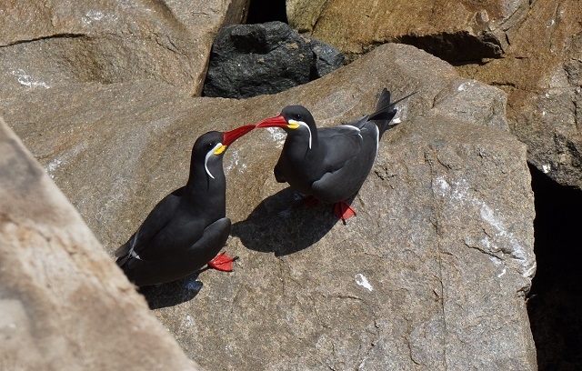 Hier beobachten und foto- bzw. videografieren wir die Riesenkrabben auf den Felsblöcken am Rand des Piers und die lautstark krächzenden Inkaseeschwalben, die sich vor allem im Gebälk des Unterbaus des Gebäudes aufhalten und dort miteinander streiten und schäkern.