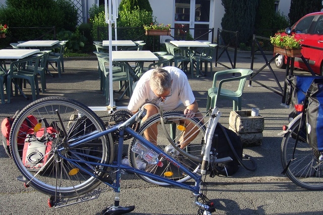 Das Frühstück schmeckt. Nach dem Beladen der Velos geht‘s noch auf die Post, zum Briefmarken kaufen, damit wir mit dem Karten schreiben beginnen können. Nachher fahren wir aus der Stadt hinaus. Wir kommen sehr gut voran. Es geht aber, wie die letzten Tage, nicht einfach gerade aus, sondern in die Rebberge hoch und wieder an die Loire hinunter. In Gennes verpassen wir den richtigen Weg, kommen wieder auf die Ebene über der Loire und fahren in die falsche Richtung. Wir fahren von der Loire weg. Mit Sonnenstand und Phantasie finden wir wieder an die Loire, auf die wir in Le Thoureil treffen. Wir sind sicher so sechs bis acht km zu weit gefahren, aber es hätte auch schlimmer sein können. Ab da geht’s weiter, alles der Loire entlang, über die Loire, den Nebenflüssen entlang. Wir fahren an Gemüse- und Blumenfeldern vorbei, (Spargeln, Zwiebeln, Lauch, Süssmais, Astern, Dahlien…) bis nach La Daguenière. Hier gehen wir in einer Bar einen Kaffee und kaltes Wasser trinken. Nachher suchen wir uns einen schattigen Platz zum Mittagessen, denn in der Zwischenzeit ist es recht heiss geworden. Gestärkt geht es weiter, alles dem Wasser entlang, zum Teil im Schatten, aber auch an der Sonne, bis nach Bouchemaine. Hier wäre die Abzweigung nach Angers. Aber wir lassen diese Stadt rechts liegen und fahren weiter. Zuerst geht es der Loire entlang, dann unter der Bahn durch und recht steil in die Rebberge hinauf. Das heisst für mich wieder einmal etwas schieben. Ich bin aber nicht die einzige. Ein Ehepaar mit je einem alten Anhänger am Velo ist auch am Schieben. Ich überhole die Frau noch beim Fahren. Mit dem Mann komme ich fast gleichzeitig schiebend oben an. Er stellt sein Velo ab und läuft zu seiner Frau zurück, um ihr das Velo abzunehmen. Vorher stellt er aber fest, dass Peter weiter fährt und mir nicht helfen kommt. Er findet das nicht sehr galant. Mein Kommentar ist: „Selbst ist die Frau!“ Von nun an geht’s rauf und runter, bei Savennières wieder steil hoch. Weil die Steigung aber nicht sehr lang ist, muss ich nicht schieben. Bei der Kirche gehen wir einen Kaffee und das obligate kalte Wasser trinken. Die beiden mit dem Veloanhänger aus dem letzten Jahrhundert sind wieder am Schieben. Wieder geht der Mann und nimmt seiner Frau das Velo ab und schiebt es hoch. Als sie an uns vorbei fahren, rühmt Peter ihn als Gentleman. Gestärkt und wieder etwas herunter gekühlt geht es weiter auf und ab und dann endgültig an die Loire hinunter. Wir beschliessen, in Chalonnes-sur-Loire zu übernachten. Da das nicht am Veloweg liegt, fahren wir nach der ersten Brücke weiter über die zweite und die dritte. Wir suchen ein Hotel, finden aber kein angeschriebenes Haus. Eine ältere Frau macht uns auf ein Gîtes aufmerksam. So landen wir bei Madame Chantal Besnard. Wir bekommen ein tolles Zimmer auf dem Dachboden des Unterstandes für 54 Euro mit dem Frühstück. Beim Apéro im Städtchen stellen wir fest, dass der Lastwagenverkehr hier ausserordentlich gross ist. Hier muss eine wichtige Kreuzung sein. Wir laufen noch etwas herum, finden aber nichts besonders Sehenswertes. Das einzige, was es hat, ist viel Verkehr mit Stau auf der Brücke. Am Loire-Ufer ist es aber schön. Wir besuchen das einzige offene Restaurant. Es ist eine Pizzeria. Nachher gehen wir früh schlafen.