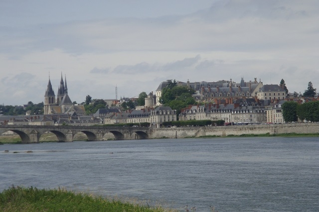 Nach einer ruhigen Nacht und einem feinen Frühstück fahren wir los. Nach etwa zwei Kilometern merkt Peter, dass er sein Velotäschli vor dem Hotel hat liegen lassen. Er fährt zurück und ich warte. Er hat Glück. Ein Angestellter des Hotels hat es gefunden. Also können wir weiter fahren. Wir haben zum Teil bereits wieder Gegenwind, kommen aber trotzdem recht gut voran. In St-Dyé möchten wir die Kathedrale anschauen. Sie wird aber renoviert und ist darum geschlossen. Also geht’s weiter nach Chambord. Aber wir verpassen die richtige Abzweigung und landen in Montlivault. Mit Hilfe der Karte finden wir mit zehn km Umweg das Château trotzdem noch. Das Château de Chambord ist grossartig. Es ist das grösste Loireschloss, in Staatsbesitz und steht dem Präsidenten zum Ferienmachen und Jagen zur Verfügung. Wir schauen uns die Anlage von aussen an und fahren dann weiter in Richtung Blois. Die Stadt betrachten wir nun vom andern Loireufer aus und essen dazu unser Zmittag, das wir bei unserem Umweg an einem Bauernstand eingekauft haben. Die flachen Pfirsiche und die Aprikosen schmecken ausgezeichnet.