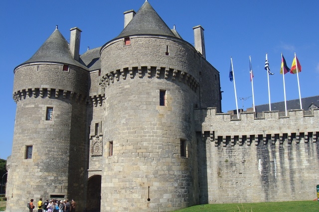 Am Morgen ist der Himmel wieder bedeckt, die Wetterprognose ist aber gut. Nach dem Frühstück machen wir uns aufs Velo. Schon bald muss ich den Pulli abziehen. Der Weg führt am Bahnhof (zwei km) vorbei, dann über die TGV-Geleise auf einen tollen Radweg. Im Nu sind wir in Guérande. Wir stellen unsere Velos bei der Kirche innerhalb der Mauern ab. Zu Fuss machen wir uns auf zu einer Stadtbesichtigung. Dabei kaufen wir die restlichen Geschenke ein. Weil es noch früh ist, hat es noch nicht so viele Touristen. Wir besuchen auch die Kirche. Ich stelle fest, dass heute die Patronin der Bretagne, Anna, die Mutter Marias gefeiert wird. In der Kirche ist auch das Grab der Anne de Bretagne, der Königin, die uns schon oft auch in Strassennamen begegnet ist. Ich zünde eine Kerze an.