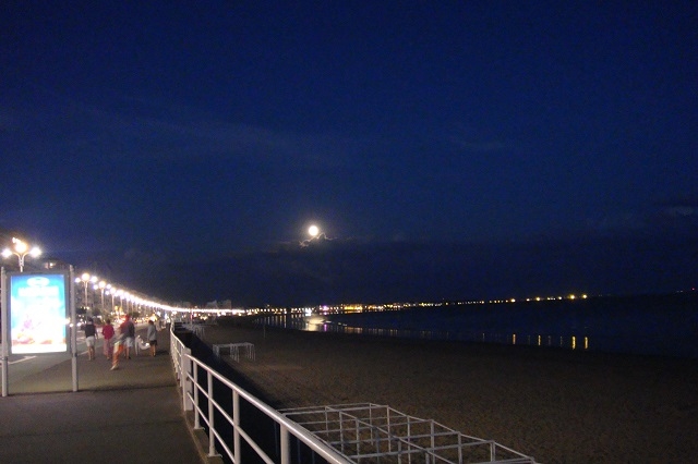 Nachher geht’s in Windeseile mit Rückenwind an Guérande vorbei nach La Baule zurück. Ginge es, aber Peter ist der Meinung, wenn wir über Pornichet fahren, wäre der Weg kürzer und besser! Aber, wie sich dann herausstellt, müssen wir auf den höchsten Hügel weit und breit hoch steissen. Der Weg führt dann auch zeitweise ganz in die falsche Richtung. Kreuz und quer geht es durch den Wald. Wir kommen dann auf der Strasse bei unserem Hotel vom Hügel herunter. Peter will noch schwimmen gehen. Ich habe genug für heute und bleibe in Hotel, um zu duschen und mich ein wenig zu entspannen. Schon bald kommt Peter wieder zurück. Er ist noch nicht geschwommen, weil er all seine Wertsachen bei sich hatte. Also nimmt er einen zweiten Anlauf, um schwimmen zu gehen. Diesmal geht er aber ohne Velo. Nachdem er zurück ist und auch geduscht hat, geht’s in den Ausgang. Wir marschieren die zwei km dem Meer entlang bis zur Fussgängerzone. Dort genehmigen wir uns zuerst einen Apéro. Peter nimmt einen Americano für 8 Euro. Nachher geht es zum Essen. Heute Gallette und Crêpe für Peter und einen Salat für mich. Um ins Hotel zu gehen, nehmen wir wieder den Strandweg. Heute ist Vollmond angesagt. Zuerst versteckt er sich noch hinter den Wolken. Dann zeigt er sich aber in seiner ganzen Grösse.