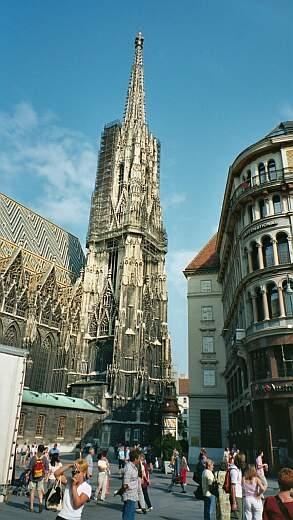 29.08.2002 Wien (A)   schön Bei der Ankunft des Zuges werden wir von einem Herrn angesprochen, der uns eine Wohnung für wenige Aufenthalts­tage anbietet. Wir nehmen das Angebot an. Auf dem Naschmarkt deckten wir uns nach dem Duschen mit Vorräten ein und picknickten auf dem Karlsplatz. Dann besichtigten wir die Karlskirche, den Stadtpark und den Stephansdom.