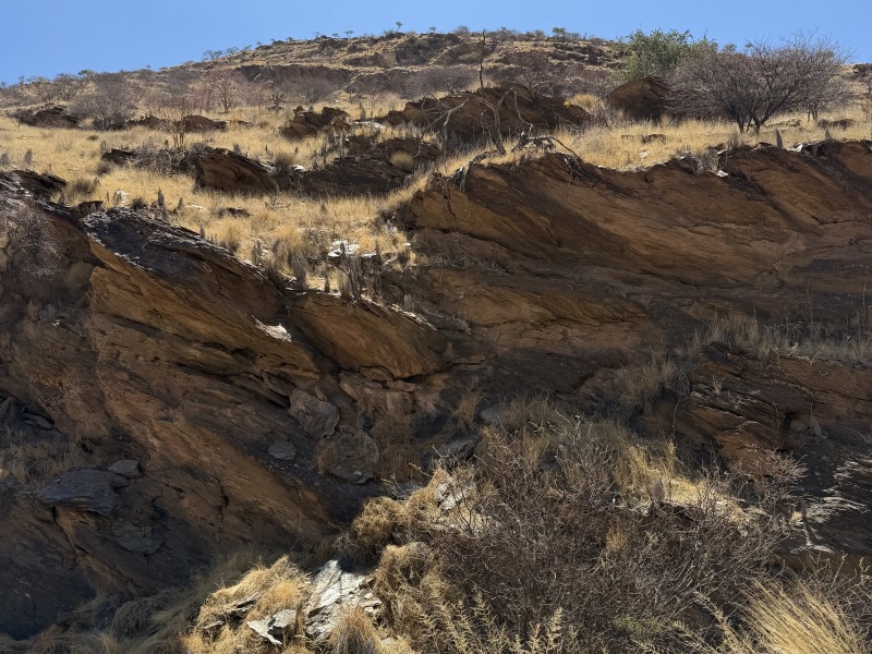 Die Strasse C 26, die über den Gamsberg Pass zur C 14 führt, finden wir nach einem kurzen Verfahrer schnell. Die ersten paar Kilometer sind asphaltiert und in gutem Zustand. Bei einer Kontrollstelle, wo ein Armeeangehöriger Führerausweis und Wagenpapiere kontrolliert, können wir bereits einige Paviane beobachte. Auf der Weiterfahrt, die bald danach auf Naturstrassen erfolgt, geniessen wir weitere Tierbeobachtungen. Viele von ihnen sind von der Distanz her unbestimmbar. Aber einige Arten sind uns geläufig, wie beispielsweise Schwarzfersen-Impalas, Kudus, Erdmännchen, Warzenschweine, Grauschnabeltokos u.a. Hinzu kommt eine von den Pflanzen her wenig vielfältige Umgebung, da Trockenzeit herrscht. Aber die Landschaftsformen sind einmalig: Weite, topfebene Flächen, ausgetrocknete Flussbetten, wilde Täler, grosse Steigungen und Gefälle, faltenreiche Berge, Tafelberge. Dazu herrscht Topwetter. Aber der Zustand der Strasse ist zum Teil bedenklich, und wir kommen nicht so schnell vorwärts wie geplant, so dass wir unsere Unterkunft telefonisch orientieren müssen, dass es später wird.