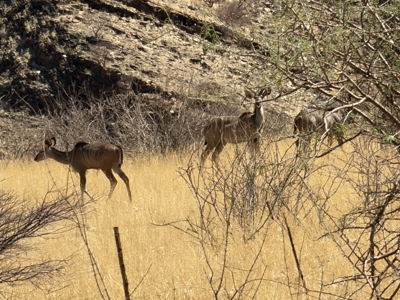 Darauf geht die Fahrt ohne grosse Unterbrüche auf gut ausgebauten Strassen weiter nach Outjo, wo in nicht allzu weiter Entfernung davon unsere von Judith gebuchte Lodge liegt. Auf einem ausgewaschenen Fahrweg, durch drei Gatter, gelangen wir zu der am Fuss grosser Felsen gelegenen Unterkunft und erhalten in einer gemauerten Hütte mit Rietdach unsere zwei Zimmer mit Küche und zwei Duschräumen. Ein kühles Getränk am Pool, ein Bad in demselben und anschliessend eine warme Dusche wecken unsere Lebensgeister wieder nach der langen Autofahrt. Natürlich konnten wir auf dieser Fahrt durch zuerst wüstenhafte, öde und später wieder reichlicher bewachsene, aber recht spärlich bewohnte Gebiete wieder einige einheimische Wildtiere beobachten.