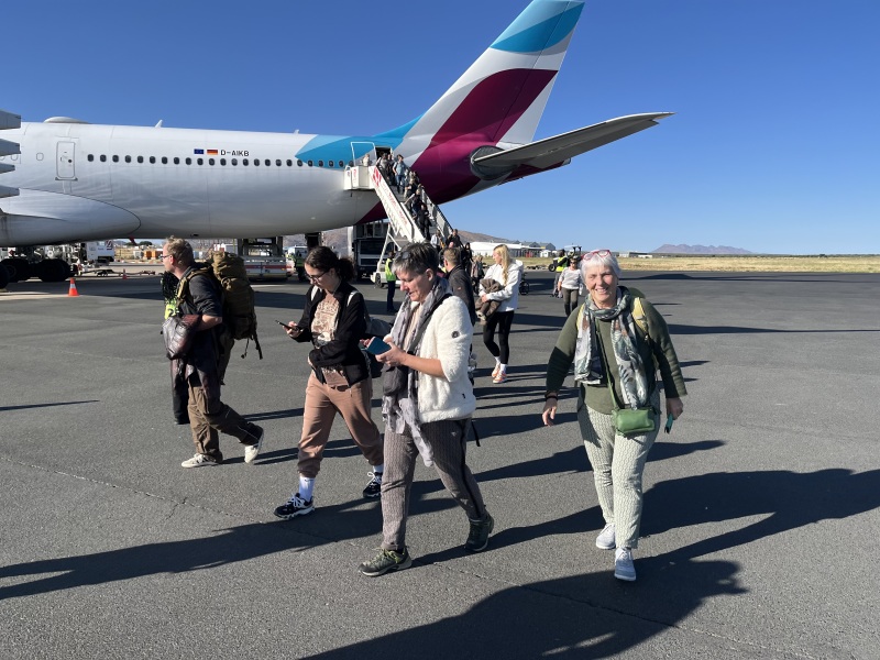 Über eine neu erstellte, pompöse Zufahrt erreichen wir das Areal des Hosea Kutako International Airports. Allerdings ist noch nicht überall angegeben, wohin man genau fahren muss, wenn man den Zugang zum Abflugeingang erreichen will. Judith kommt auch da nochmals dazu, ein Stück Naturstrasse zu befahren. Das Mietauto bringt sie zusammen mit Mila zur Station zurück und kann es problemlos abgeben. Margrit und ich hüten unterdessen das Gepäck. Jetzt folgt der langweiligste Abschnitt einer solchen Reise, die Abflugprozeduren über sichergehen lassen.
