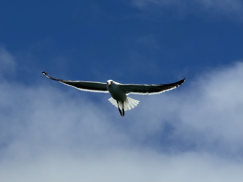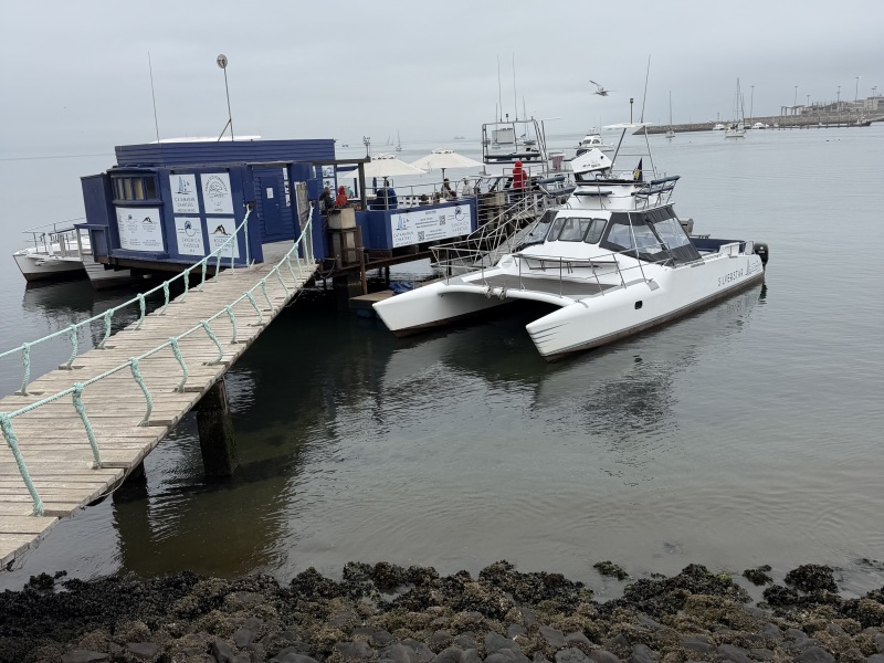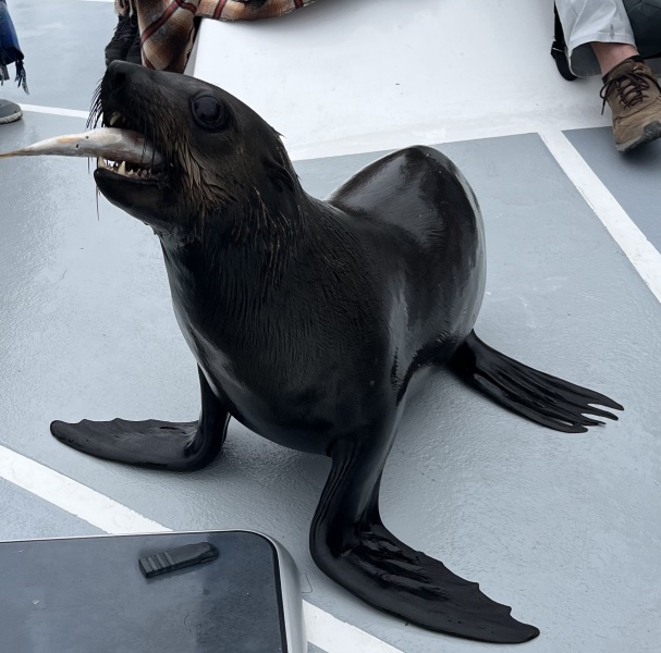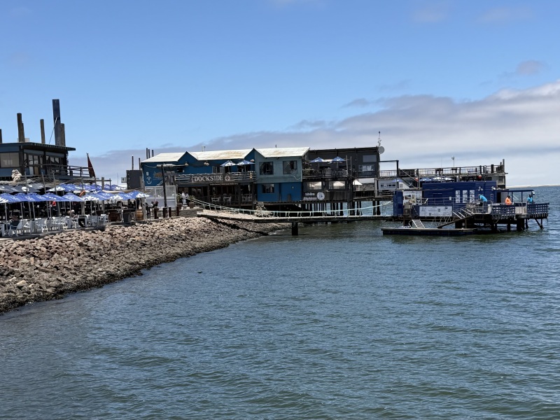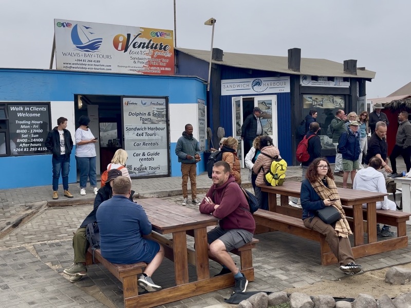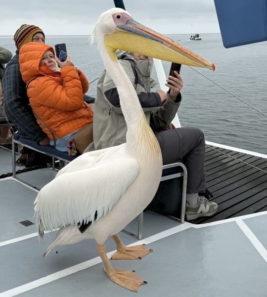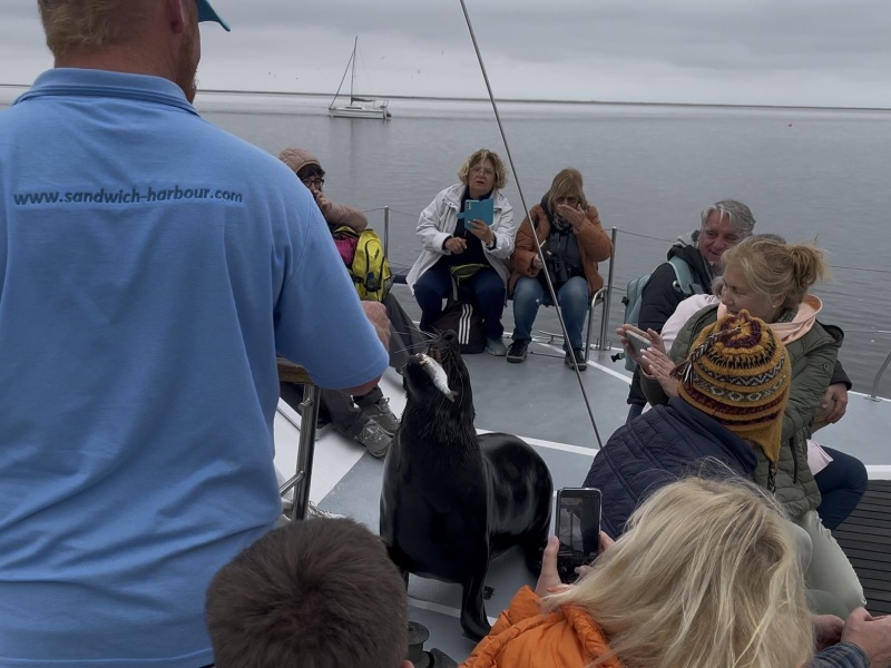 Nach dem Frühstück in einer Kneipe im Hafenareal von Walvis Bay begeben wir uns auf eine Katamaran-Rundfahrt in der gleichnamigen Bucht. Das Wetter ist kühl und die Region Nebel verhangen. Jedefalls haben wir uns für diese Verhältnisse mit Pullover, Fliess- und Regenjacke richtig angezogen. Zusammen mit rund zwanzig anderen Personen begeben wir uns auf den Katamaran „Silvercloud“. Guide Steven begrüsst uns und gibt die Regeln bekannt, die auf solchen Exkursionen einzuhalten sind. Darauf fahren wir hinaus in die Bucht. Kaum abgelegt, besucht uns eine Kap-Pelzrobbe, die problemlos auf Deck springt und zum Gaudi der Passagiere durch die Reihen spaziert.  Sie wird von Steven mit Fischen bei Laune gehalten. Schon bald gesellt sich ein weisser Pelikan dazu und lässt sich ebenfalls von Steven füttern. Nicht ganz alle Leute geniessen dieses Schauspiel, weil sie sich vor den Tieren fürchten oder ekeln. Nun gesellen sich auch noch Möwen dazu und lassen sich füttern, alles in allem ein spannendes Schauspiel, allerdings mit der Auflage, dass niemand die Tiere berührt.