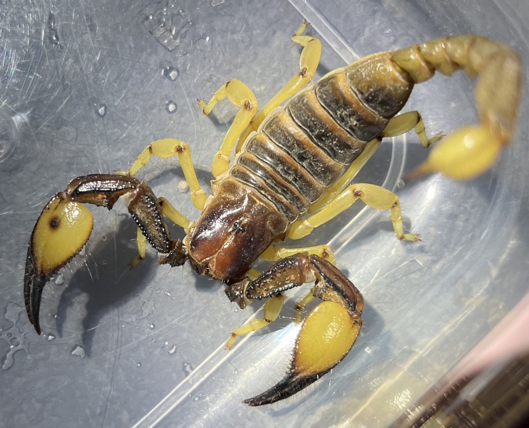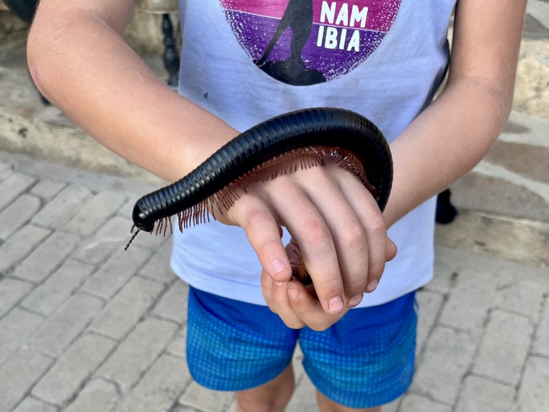 Der Sohn der Besitzerfamilie, geschätzte acht Jahre alt, zieht mit einem gefangenen Tausendfüssler von noch nie gesehener Grösse unsere Aumerksamkeit auf sich. Ohne Ängste hält er dieses Riesenbiest in den Händen und lässt es herumkrabbeln.  In der Lodge gibt es ein schmackhaftes Nachtessen im Freien bei angenehmen Temperaturen. Die Frösche quaken in die Stille der Nacht.  Und darauf zieht der Vater mit einem in einer Plastikdose  gefangenen Skorpion die Aufmersamkeit auf sich. Wir bestaunen das offenbar aus der Fassung geratene Tier und erkundigen uns bezüglich seiner Giftigkeit. Es ist sicher nicht harmlos, aber sterben würde niemand wegen einem Stich, meint er.  Und jetzt legen wir uns schlafen. Gute Nacht!
