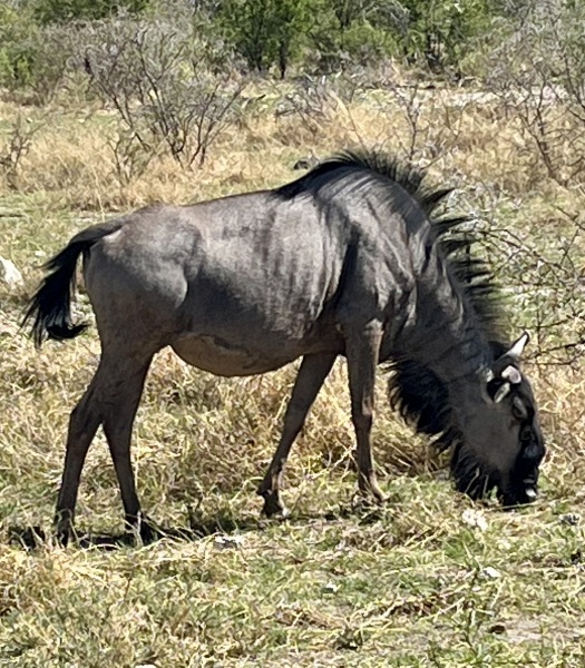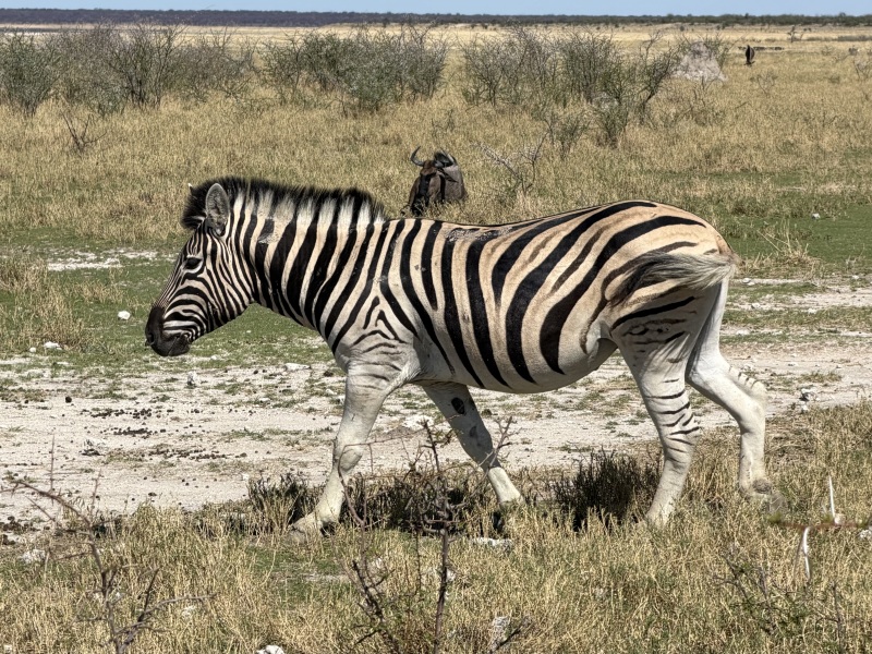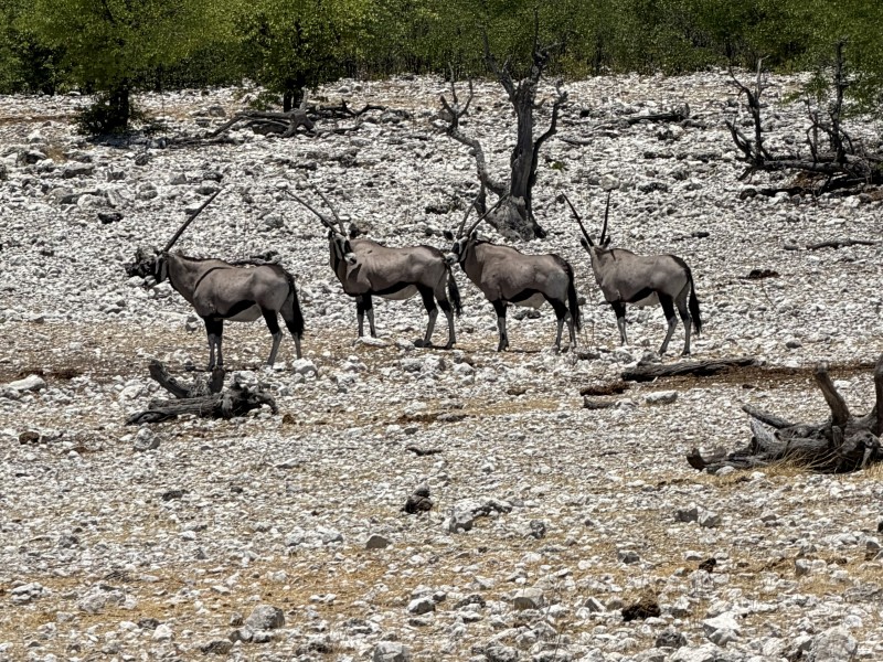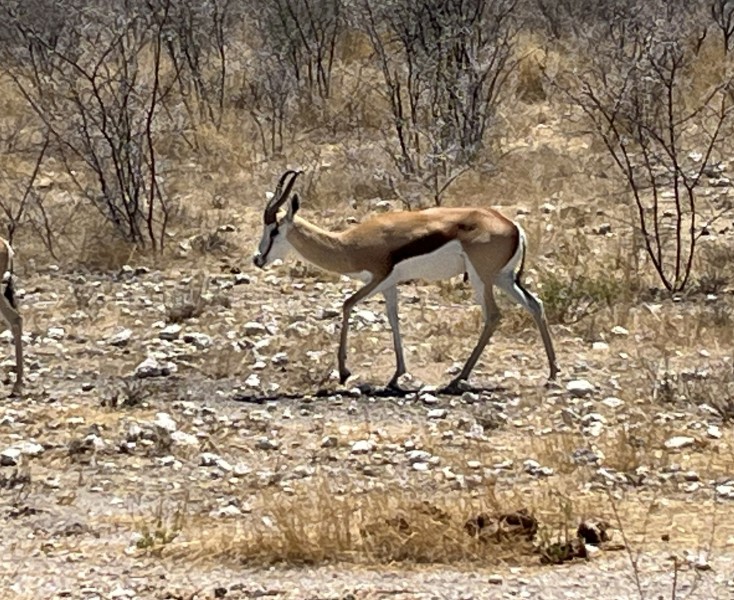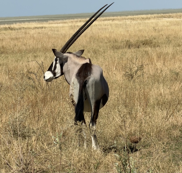 Die Reise geht weiter. Nach dem Frühstück im Namutoni-Restaurant starten wir, das Auto vollgepackt. Da wir noch bis 13 Uhr im Etosha-Park bleiben können, fahren wir noch ein paar Wasserlöcher in der Umgebung an. Diese allerdings enttäuschen uns. Zwar sind in einiger Enfernung wenige Säugetiere zu sehen, aber in unsere Nähe kommen sie nicht. Auch die Vögel machen sich rar. Aber zwischen den Wasserlöchern ist einiges los und wir sehen Tiere, die gestern weniger gut zu beobachten waren, heute näher an den Fahrrouten. Mit einigem Bedauern nehmen wir entgegen, dass Löwe, Nashorn, Kaffernbüffel und Leopard bisher nicht auftauchten.