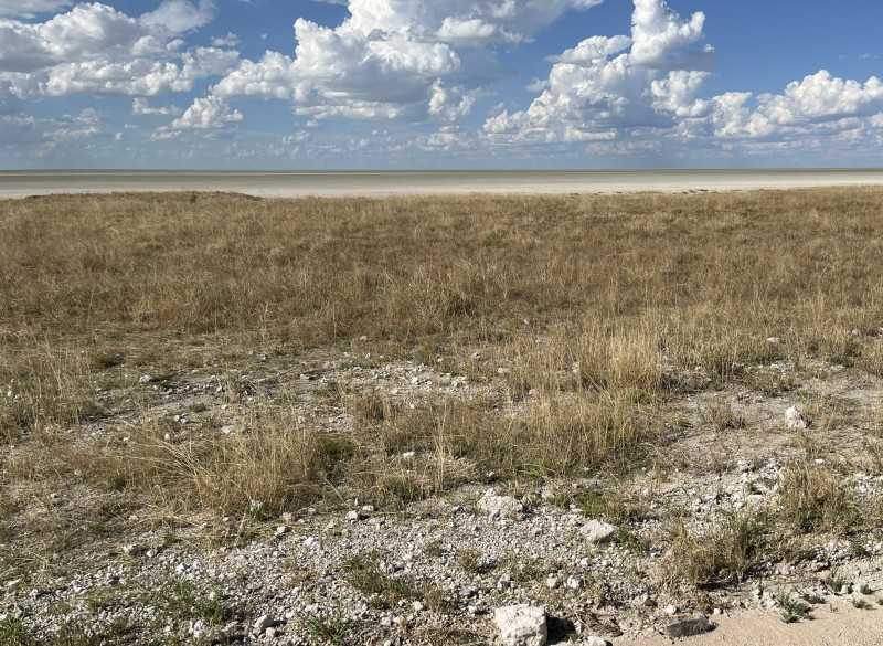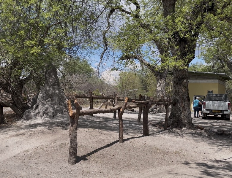 Heute Morgen werden wir in unserer Lodge fürstlich bewirtet und können das Frühstück im Garten der Besitzerfamilie geniessen. Danach packen wir unsere Sachen, verladen sie ins Auto, verabschieden uns von den Gastgebern und fahren los. Ziel ist der Etosha Nationalpark, der etwas mehr als halb so gross ist wie die Schweiz. In Outjo werden  der Tank gefüllt und ein paar Lebensmittel eingekauft, wobei vor allem Wasser eine wichtige Rolle spielt. Das Wetter ist klar und die am Morgen früh noch kühle Luft erwärmt sich in kurzer Zeit auf mehr als 300 Celsius, schliesslich ist hier in Südwestafrika Frühsommer.