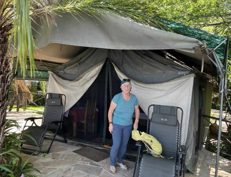 Schon kurz danach fahren wir in die von Judith gebuchte Lodge ein, werden da vom Chef freundlich begrüsst, mit den Regeln bekannt gemacht, zu unseren Zelten begleitet und da über deren Verwendug orientiert.