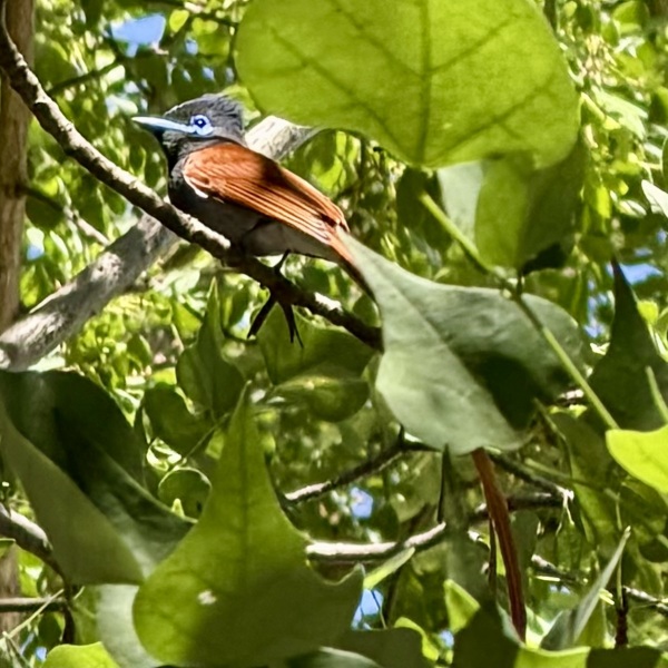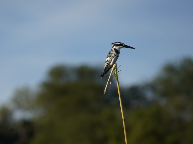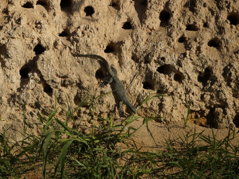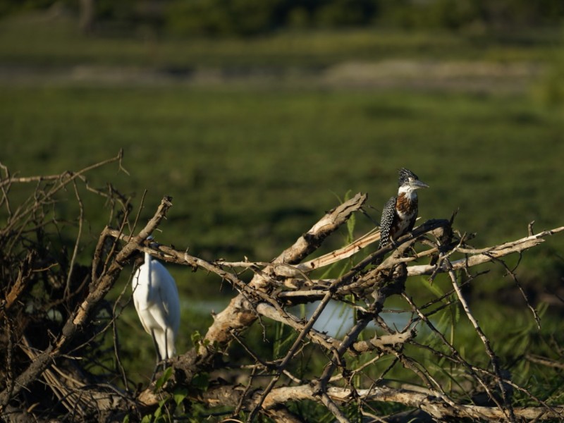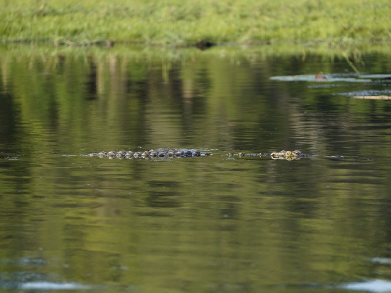 Am Morgen werden wir früh geweckt, da Tiere auf dem Zeltdach aktiv sind. Aufgrund der Entfernung und des dichten Laubwerks der umliegenden Bäume lässt sich keine genaue Beobachtung anstellen. Meine Tochter aus dem Nachbarzelt berichtet, dass sie dort zwei ausgewachsene Katzen und drei Jungtiere gesehen habe, die miteinander spielten. Sie bestimmte die Biester als Ginsterkatzen. Es ist nicht klar, um welche Art es sich genau handelt. Auf der anderen Flussseite lassen sich verschiedene Tierarten mit Fernglas oder Feldstecher beobachten.