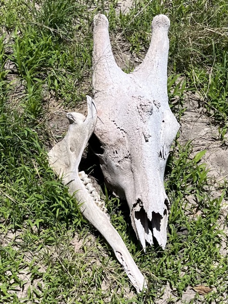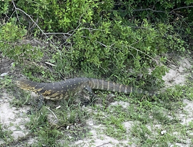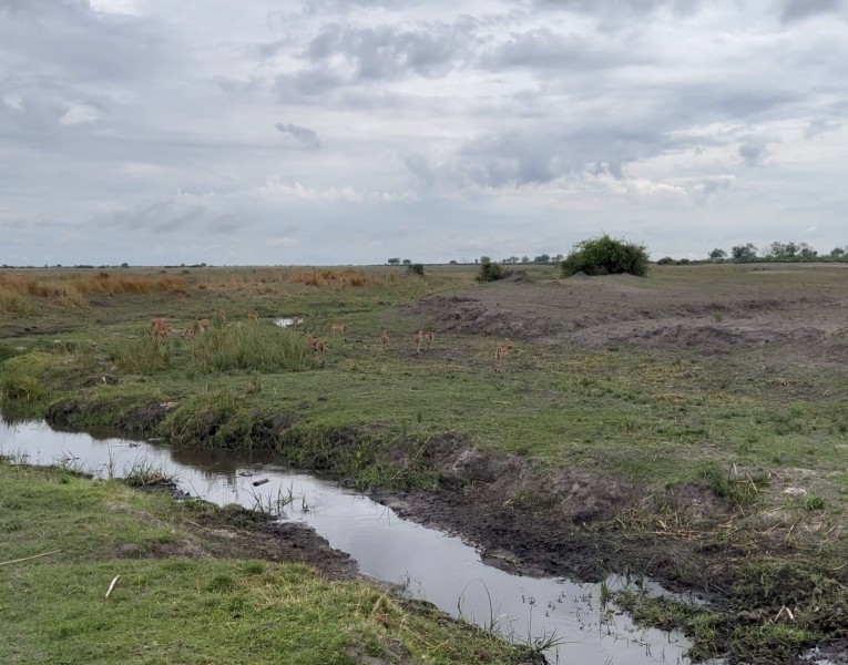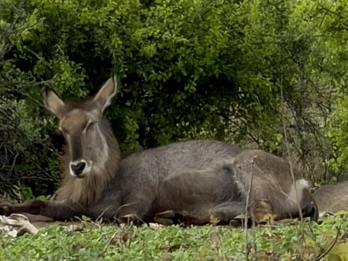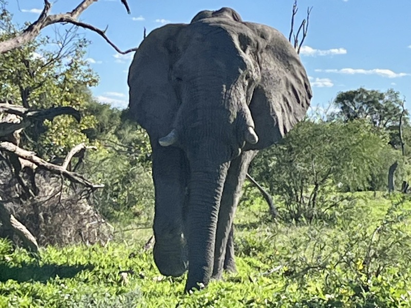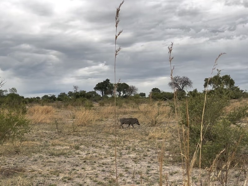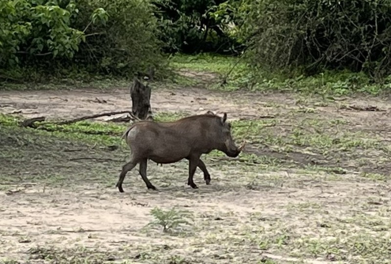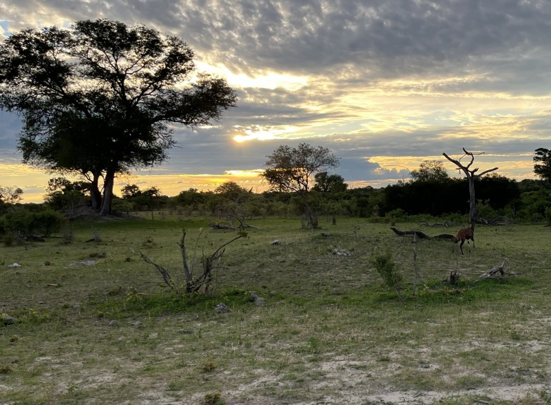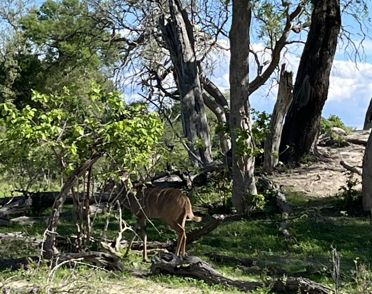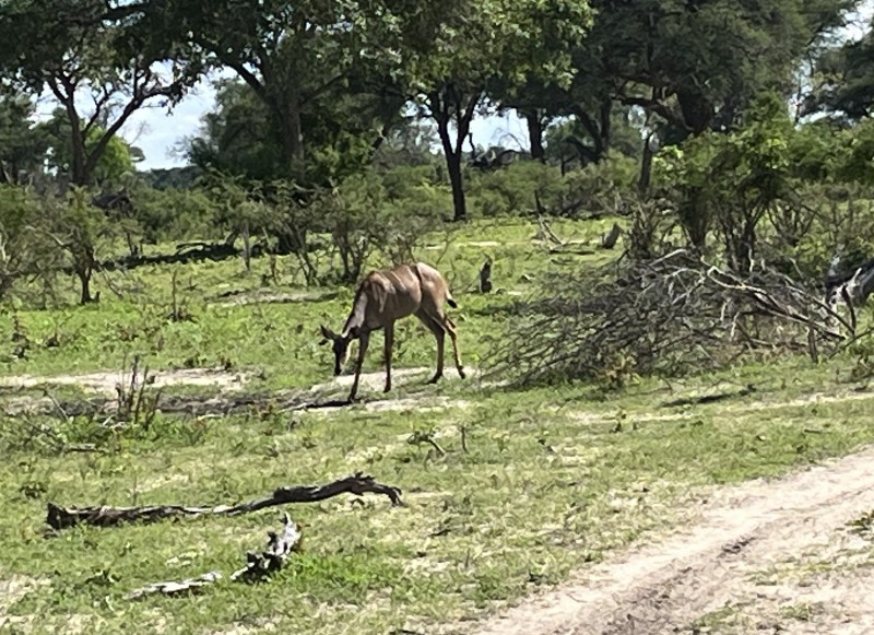Um 15 Uhr startet unsere gebuchte Tour auf das gegenüberliegende Ufer des Okawango. Wir besteigen zu viert das Boot, das uns auf die andere Seite bringt. Da wartet schon ein Guide mit einem Safarifahrzeug auf uns. Wir haben genügend Platz, sitzen erhöht und können so die Fahrt besser geniessen. Der Guide macht uns auf Tiere aufmerksam, hält an zum Fotografieren und Erklären. Wir begegnen einerseits verschiedenen Antilopen wie Kudus, Buschbock, Schwarzfersenimpala, aber auch Warzenschweinen, Erdhörnchen, Heimperlhühnern, Flusspferden usw. Irgendwann regt sich in den Büschen etwas, was sich als Waran herausstellt. Weiteren zwei Exemplaren begegnen wir auf der Weiterfahrt am Wegrand. An einer Stelle am Fluss liegt ein toter Elefant, der u.a. von Geiern, Marabus und einem Krokodil zerlegt wird, und als der Wind in unsere Richtung weht, fürchterlich stinkt. Unser Guide meint, dass er an einer Krankheit starb. Als wir an der Rückfahrt sind, ändert er plötzlich die Richtung und fährt mit uns in ein Areal, in dem Ruinen ehemaliger Wohn- und  Wirtschaftsgebäude liegen. Und hier erleben wir einen weiteren Höhepunkt: Da liegt im Feld draussen ein junges Lösenweibchen, das sich bei unserem Erscheinen etwas weiter weg bewegt, sich dort wieder hinlegt, uns einerseits aufmerksam überwacht, aber auch gespannt auf eine nahe Gruppe Impalas achtet. Wir werden darauf im Eilzugtempo auf wüst deformierten Strassen schüttelnd und rüttelnd zum Ausganspunkt unserer Safarifahrt gebracht, wo wir uns vom Guide dankend verabschieden und mit dem Boot zur Lodge zurückgefahren werden.