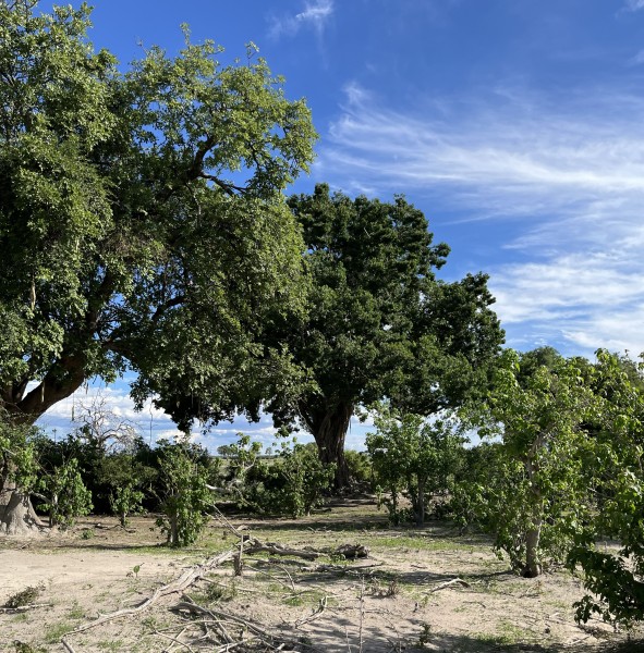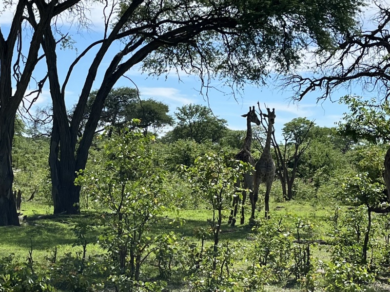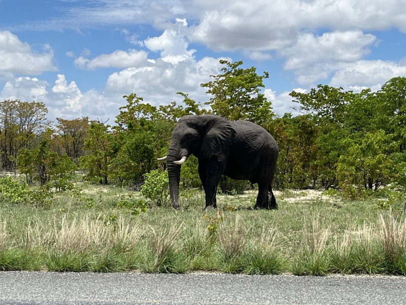 Nachdem wir unser Frühstück genossen haben, machen wir uns auf die Fahrt Richtung Maun. Von der kürzeren Strecke durch den Chobe Nationalpark über Savuti nach Maun wurde und infolge der massiven Regenfälle in den letzten Tagen abgeraten,da diese Route unbefestigt ist. So machen wir den langen Weg über Kasane und Nata. Trotz langen, pfeifengeraden Abschnitten und langem Sitzen, ist die Fahrt abwecchslungs-reich. Da sind zum Beispiel die Überquerungen der Strasse durch Tiere. Eine Giraffe, mehrere Elefanten, Heimperlhühner, Rinder, Ziegen und Esel zwingen Judith, unsere Driverin, zum Anhalten, und wir Passagiere filmen und fotogfürafieren. Judith wird aber auch durch die Strassnverhältnisse gefordert. Auf mehreren Abschnitten werden die Strassen erneuert, und zwar so, dass unmittelbar neben der alten, löcherigen Fahrbahn die neue Trasse gebaut wird. Das heisst, dass hier Geschwindigkeitsbegrenzungen herrschen. Und so werden wir unvermutet von der Polizei auf die neue Trasse gewiesen und Judith wird vorgeworfen, die erlaubte Geschwindigkeit überschritten zu haben. Im Pölizeiauto wollen ihr die beiden Polizisten das Fehlverhalten auf Video demonstrieren, finden aber dieses aber nicht mehr und lassen sie dann mit einer Ermahnung springen.