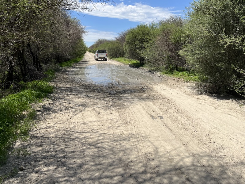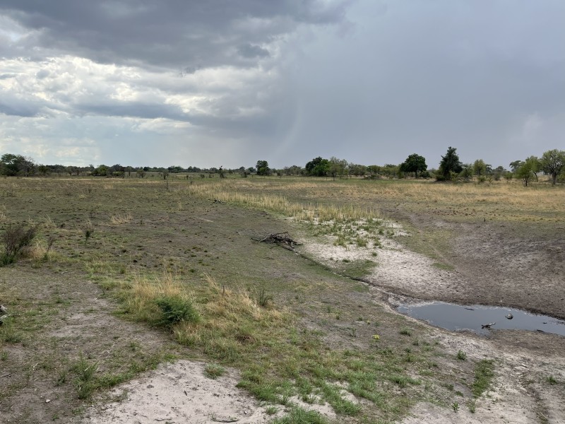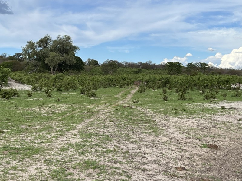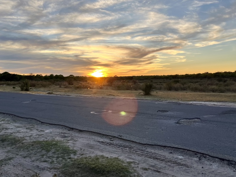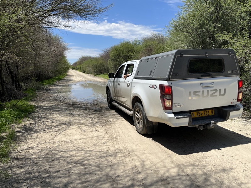 Beim Frühstück ist es kühl und immer wieder fallen ein paar Regentropfen. Am Wasserloch ist ganz wenig los. Und heute müssen wir auf die asphaltierte Strasse Richtung Ngoma gelangen, um nach Botswana hinüberzukommen.
