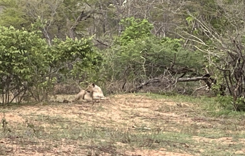 Bald darauf gibt Judith vom Hinersitz aus Löwenalarm durch. Unser Guide reagiert umgehend, fährt mit uns in die Büsche, und da räkeln sich, ohne grosse Reaktion auf unsere Anwesenheit, insgesamt neun Löwen, ein Mann, Weibchen und Jungtiere unter verschiedenen Büschen. Sie schenken uns hie und da ein Augenzwinkern und/oder ein gelangweiltes Gähnen.