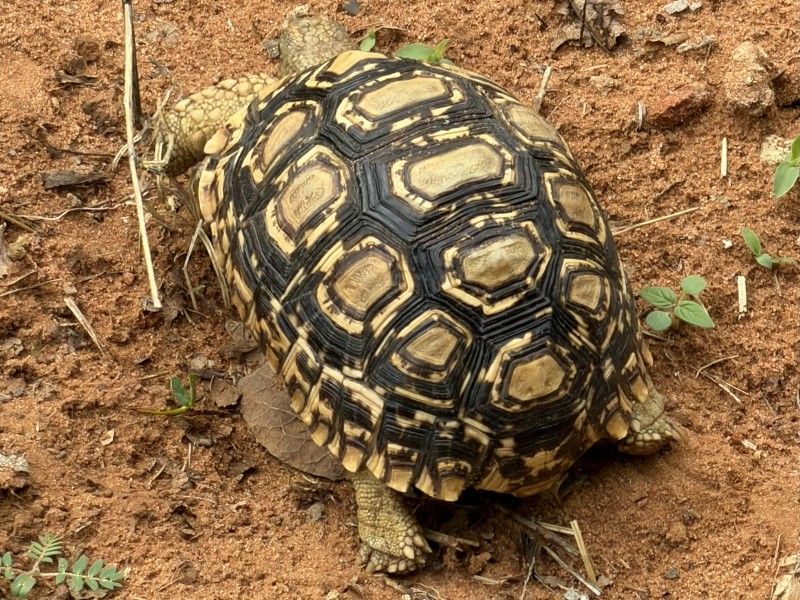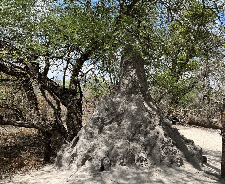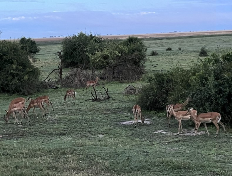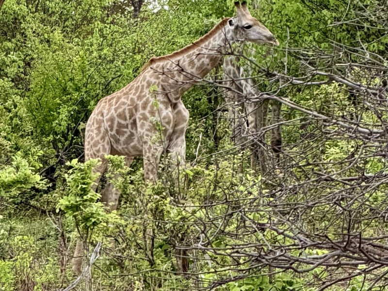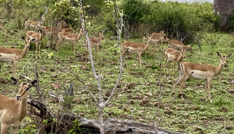 Die beiden Guides machen uns keine grossen Hoffnungen bezüglich Tierbeobachtungen, da die Fühsommermonate auf der Südhälfte genügend Niederschläge kriegen und die Tiere einerseits seltener zu den Wasserlöchern kommen, andererseits sich in den grün gewordenen Sträuchern und Bäumen besser verstecken können.  Mai bis Juli wäre die günstigere Zeit. Da es viel geregnet hat, sind die Fahrwege ausgewaschen, teilweise steht Wasser darin, teilweise sind sie massiv erodiert, es ist eine ruppige Fahrt. Die beiden wissen viel zu erzählen, müssen nur einmal rückwärts fahren, um neuen Anlauf zu holen, und sie zeigen uns doch einiges Sehenswertes. Wir werden vor einem Termitenhügel über die ökologische Bedeutung dieser Tierchen orientiert, fahren unter einem Baum mit den auf einem Ast deponierten Überresten einer Leopardenbeute durch, sehen zwei männliche Giraffen, verschiedene Antilopen, erfahren, weshalb die Schwarzfersen-Impalas neu Mac Donald-Gazellen heissen, und vieles mehr. Zudem gibt es mitten in den Büschen, wo sich weit und breit keine gefährlichen Raubtiere aufhalten, eine Kaffeepause mit einem schön gedeckten Tischchen. Jedenfalls sind die drei Stunden schnell vorbei, und die beiden verabschieden sich von uns beim Gate, wo unser Auto steht.