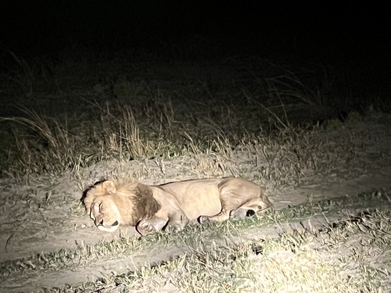 Nachtessen gibt es für uns eine halbe Stunde früher, da wir uns alle vier für die Abendsafari angemeldet haben. Leider fühlt sich Judith nicht gut und klagt über Darmkrämpfe. Sie ermuntert uns, den Ausflug ohne sie mitzumachen. So treffen wir nach dem Essen zusammen mit einer holländischen Familie unseren heutigen Guide vor der Rezeption unserer Lodge und fahren gespannt mit ihm hinaus in die dunkle Nacht. So dunkel ist sie allerdings nicht, steht doch neben ihm ein Helfer, der während der Fahrt ständig mit einem Scheinwerfer, den er hin und herschwenkt, das Gelände ausleuchtet. Die reflektierenden Augen der angepeilten Tiere verraten ihren Standort. So stossen wir neben den auch tagsüber beobachtbaren Warzenschweinen, Impalas usw. auf nachtaktive Tiere wie den Springhasen, der wie ein Känguru auf seinen Hinterbeinen weghüpft und die kurzen Vorderbeine nach vorne streckt. Höhepunkte dieser Nachtfahrt ist ein Serval, der sich im Gebüsch versteckt hält, sowie ein ausgewachsener Löwenmann, der mitten auf der Fahrpiste schläft und sich weder durch die Motorengeräusche noch durch das Klicken der Kameras und die Ahs und Ohs der Exkursionsteinehmer wecken lässt. Schliesslich muss sich unser Guide am Ende beeilen, um den Park rechtzeitig zu verlassen, denn er hat nur bis 22 Uhr die Erlaubnis, sich mit Touristen darin aufzuhalten.