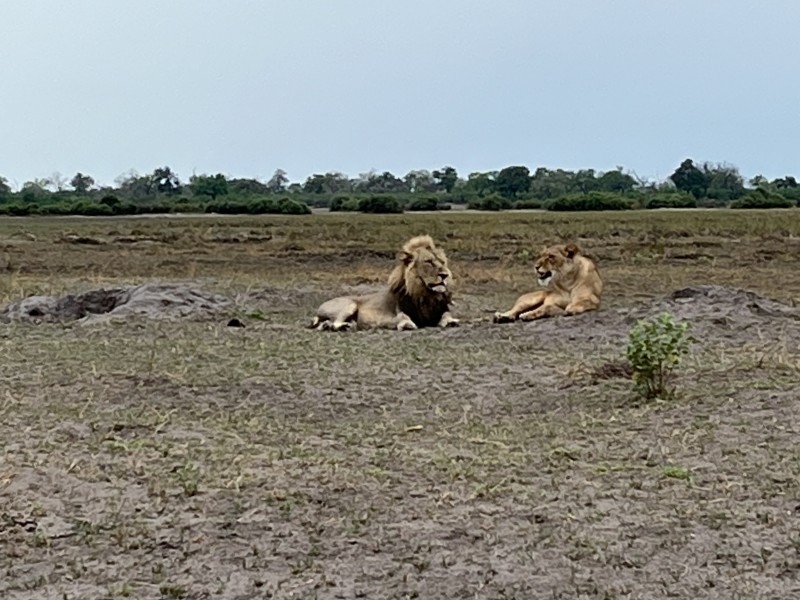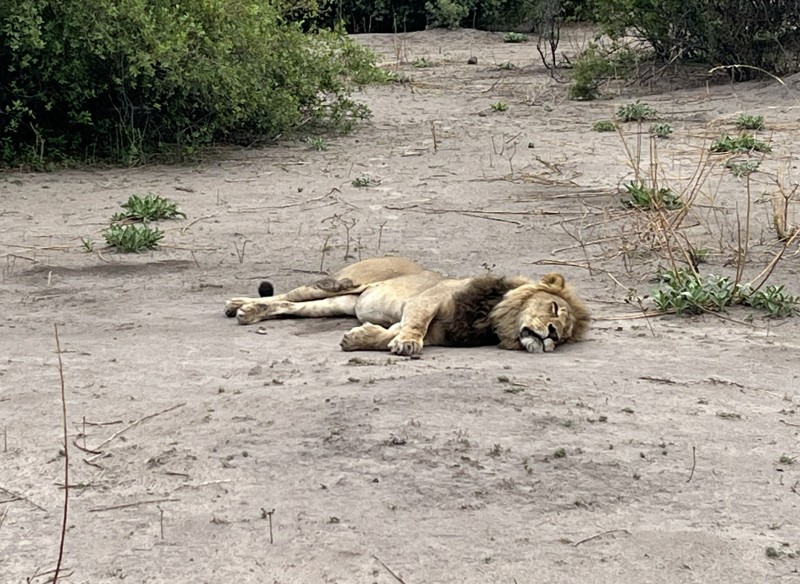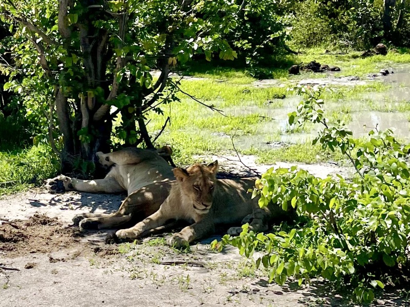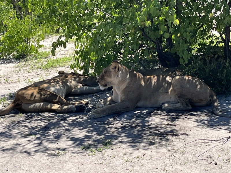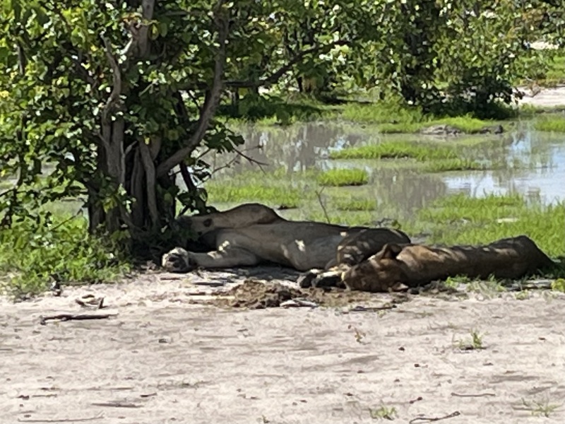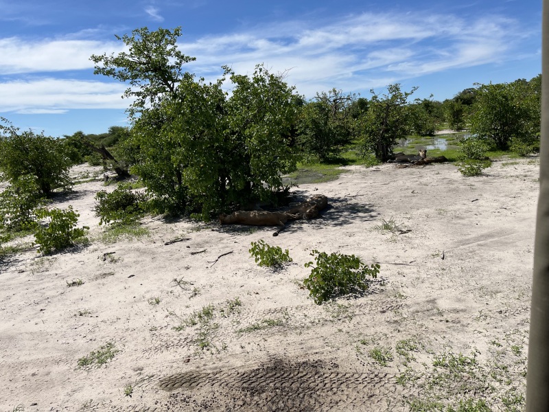 Um 16 Uhr fahren wir zurück zum Gate, wo uns unser Guide abmeldet. Auf der Piste Richtung Maun treffen wir nochmals auf verschiedene einheimische Wildtiere. Natürlich fährt unser Guide nochmals bei den Löwen vom Morgen vorbei, und sie sind immer noch am Ausruhen und sich Räkeln.