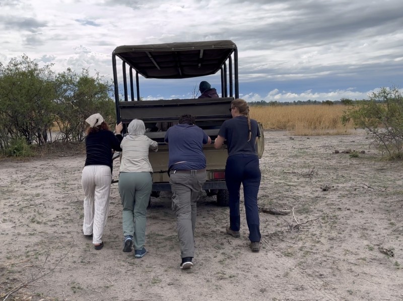 Danach folgt der kritische Moment. Der Anlasser klickt, der Motor läuft nicht an. Wir schaffen es vereint, das Fahrzeug so anzustossen, dass es zum Fahren kommt, und können einsteigen. Die nächste Etappe des vormittäglichen Ausflugs findet im Boot auf dem Linyati River statt. Am Flussufer angekommen, steigen wir auf ein bereitstehendes Boot um. Westy gibt Gas, das Boot ist nicht steuerbar. Mit der Ruderstange und mit Hilfe des Motors schafft er es zurück an die Landestelle, und wir steigen aus. Ein zweites Boot, das daneben liegt, funktioniert ebenfalls nicht. Wieder warten wir, bis ein Helfer eintrifft, der den Motor zum Laufen bringt. Zum Glück regnet es nicht mehr. Der herbeigerufene Mann schafft es, und wir können die geplante Fahrt auf dem Fluss erleben. Auch da gibt es einiges zu beobachten. Und nach dem Umstieg auf den Geländewagen funktioniert auch der wieder ordnungsgemäss.