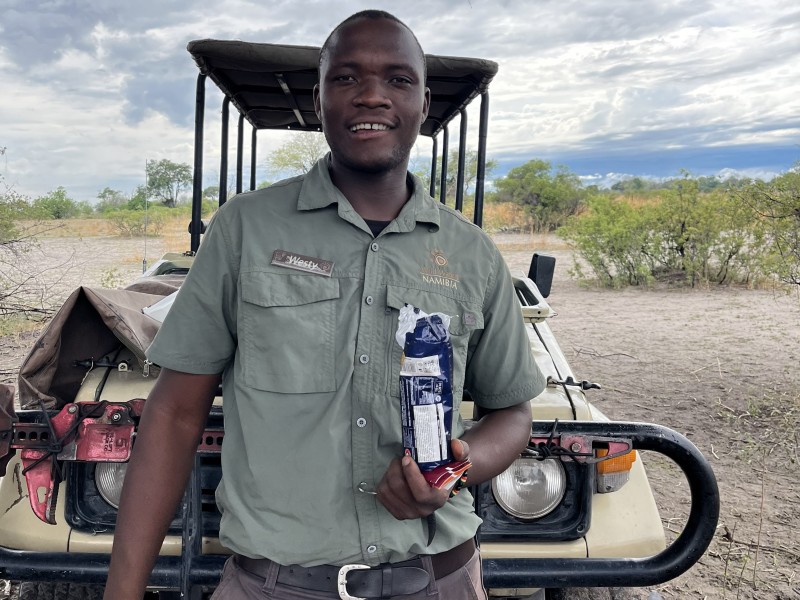 Sonntag ist Ruhetag, daran halten wir uns heute weitgehend. Tagwache ist um viertel vor sechs angesagt. Wir sind aber bereits eine halbe Stunde früher wach. Gestern Abend haben wir schon unser Frühstückspaket gefasst, da wir bereits um viertel nach sechs starten. Ziel ist das Eingangsportal in den Chobepark bei Ngoma. Dort werden wir von zwei jungen Männern, die uns drei Stunden durch das Reservat führen werden, mit einem Allrad-Geländefahrzeug abgeholt. Die Wartezeit überbrücken wir mit dem Breakfast-Paket. Die Fruchtsäfte sind o.k., aber mit den zwischen Toastscheiben eigeklemmten Spiegeleiern, eingepackt in Alufolie, haben wir dann doch einige Mühe.