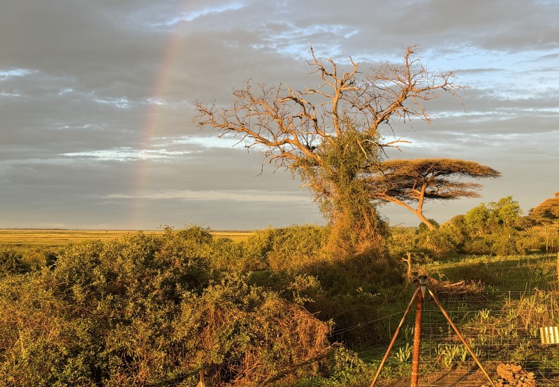 Um halb sieben haben wir bereits alles gepackt, den Allrad beladen und können zum Frühstück gehen, das allerdings erst um sieben bereit ist, Die Wartezeit vertreiben wir uns auf der Terrasse der Lodge, wo bereits auch andere Gäste auftauchen, Der Tag ist angebrochenen. Wolkenbilder, blaue Fenster, ein Stück Regenbogen und intensive Farben bieten ein eindrückliches Schauspiel. Dazu gesellt sich eine klangliche Kulisse – die unterschiedlichen Vogelstimmen, das Quaken der Lurche, das Zirpen verschiedener Insekten uns das ferne Schnauben der Flusspferde.