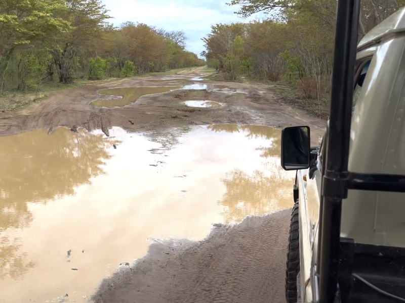 Wir packen unsere Sachen und stellen sie bereit. Beim Bezahlen unsere Konsumationen schauen wir, dass wir möglichst viel bar begleichen können, denn ab heute verbringen wir die nächsten Tage in Botswana. Wir verabschieden uns von den beiden Frauen, die für die Lodge zuständig sind und fragen noch nach dem Zustand des Weges. Sie machen uns Mut, dass der Weg mit dem Allrad ohne grosse Probleme zu bewältigen ist. Judith geht dennoch mit Respekt daran, und sie schafft’s bravourös. Es sind doch einige Stellen zu meistern, seien es sandige oder überflutete Wegstücke, die Konzentration und Können erfordern. So kommen wir auf die Strasse C49 und erreichen schon bald über eine Abkürzung die Strasse B8, die nach Ngoma Bridge führt. Vorsichtshalber schalten wir den Mittagshalt kurz vor der Grenze ein, weil wir befürchten, dass wir unser Obst abgeben müssen.