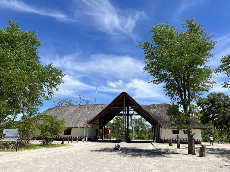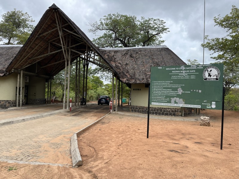 Beim namibischen Posten parken wir das Auto vor dem Gebäude und begeben uns in einen Raum, wo hinter drei Schaltern mit Glasfront zwei grimmig blickende Uniformierte vor einem Computer sitzen. Der eine kontrolliert die Pässe und macht einen Stempel hinein, der zweite nimmt die Autodaten auf. Zuletzt schreibt Mila unsere Namen auf eine Liste und wir unterschreiben alle. Danach geht die Fahrt weiter zum Botswanischen Posten. Judith muss durch ein Reifen-Desinfektionsbad fahren und parkieren. Wir steigen aus und müssen mit beiden Schuhen in eine Wanne mir einem Desinfektionsmittel treten. Dabei werden wir von drei Personen überwacht. Nun betreten wir wieder einen Schalterraum, wo die Pässe kontrolliert und eine Eintrittsgebühr erhoben wird. Wir besteigen das Auto und fahren zur nächsten Kontrollstation, wo wir aufgefordert werden, auszusteigen, den Kofferraum zu öffnen und die Sohlen aller anderweitig mitgeführten Schuhe in die Desinfektionswanne zu tauchen. Endlich dürfen wir weiterfahren.