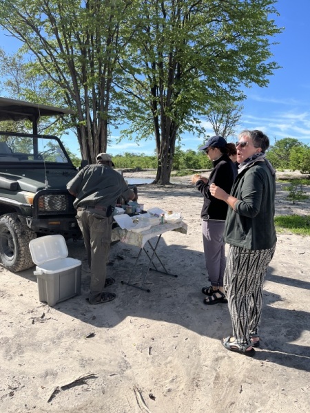 Weitere Höhepunkte folgen. Wir begegnen vier Löwinnen, die ihrem Verhalten nach auf der Jagd sind. Sie schleichen in angespannter Haltung durch die Büsche, bleiben stehen, lauschen, beobachten und verschwinden aus unserer Sichtweite. Unser Guide sucht einen Rastplatz fürs Mittagessen, das er ebenfalls mit sich führt. Das Tischchen wird wieder aufgestellt. In verschiedenen Boxen werden Salate, Gemüse, Hühnchenstücke, Gebäck und Kartoffeln zur Auswahl angeboten. Getränke aus der Kühlbox, Teller, Besteck, Trinkbecher und Papierservietten sind ebenfalls dabei. Dazu stellen die beiden Begleiter auch Faltschemel auf, und wir dürfen uns bedienen. Unser Mittagessen in der Wildnis schmeckt köstlich.