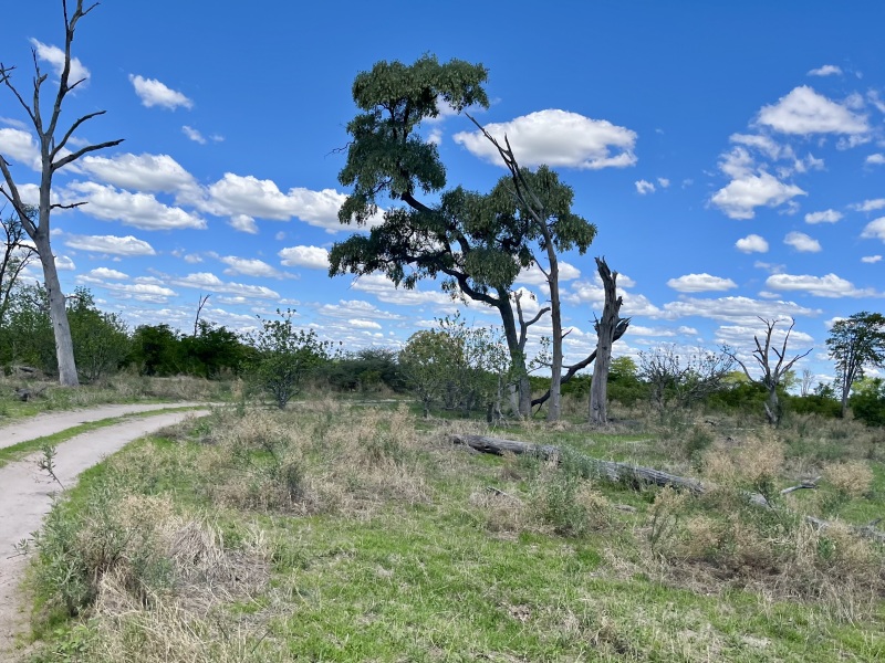 Unsere Reise nähert sich dem Ende. Wir verlassen Maun, nachdem wir unser Auto voll aufgetankt haben, und fahren Richtung SW. In Sehithwa zweigen wir von der Hauptstrasse A 3 auf eine Natustrasse Richtung Süden ab, in der Absicht an den auf der Botswana-Karte eingezeichneten Lake Nkami zu gelangen. Vorerst fahren wir noch durch das Dorf mit den weit auseinandergelegenen Häuschen und den grossen Grundstücken. Dann führt die Strasse durch Weideland. Als wir nach wenigen km auf den vermeintlichen See stossen, führt die Strasse weiter, links und rechts von dichtem, stacheligem Buschwerk begrenzt. Dort wo einmal Wasser war, ist jetzt der Boden trocken, und nur eine klitzekleine Pfütze blieb übrig. Ob der ganze See verschwunden ist, das haben wir nicht überprüft. Jedefalls kann ich versichern, dass vor acht Jahren hier noch Wasser stand.