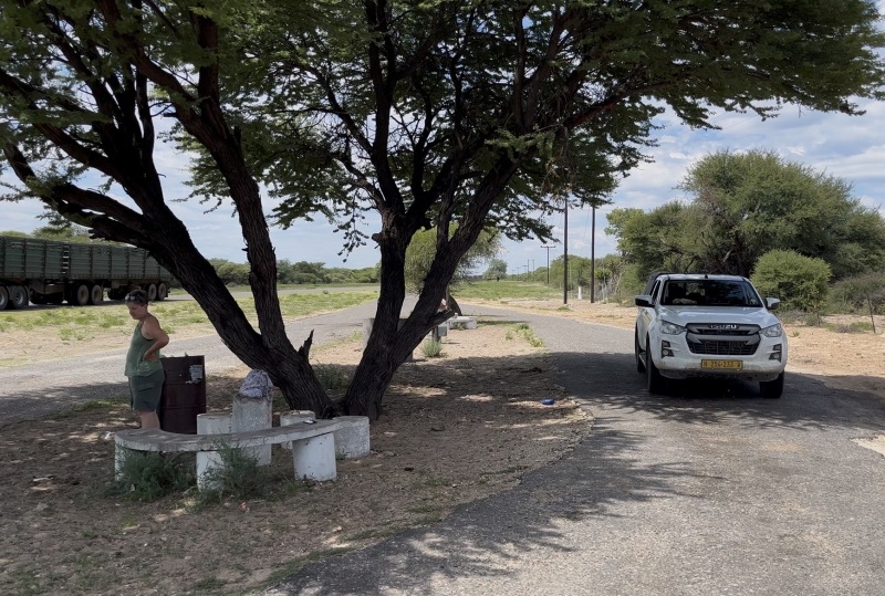Ein paar km nach Ghanzi müssen wir rechts in die A 2 einbiegen, um nach Namibia zu kommen. Bei Charles Hill finden wir eine offene Tankstelle, nachdem wir vorher mindestens an zwei aufgegebenen Servicestellen vorbeigefahren sind.