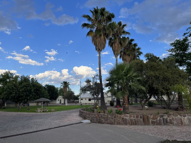 Danach geht die Fahrt weiter. In Rundu, unserem Zielort, ist viel los. Deshalb herrscht stockender Verkehr und die Autofahrer drängeln überall durch. Wir kommen ohne Schaden durch und finden nahe dem Ufer des Kavango-Flusses unsere Lodge, wo wir überaus feundlich mit einem kühlen Drink empfangen werden. Wir bekomme zwei fantastische Bungalows in einem prächtigen Park zugewiesen, können uns im Pool etwas abkühlen, währen dunkle Wolken und dumpfes Donnerrollen ein Gewitter ankündigen, das dann doch nicht eintrifft.