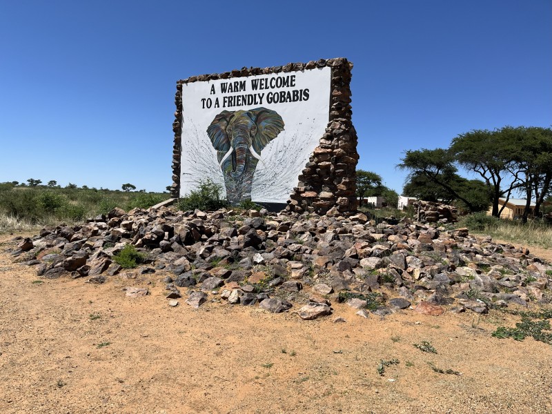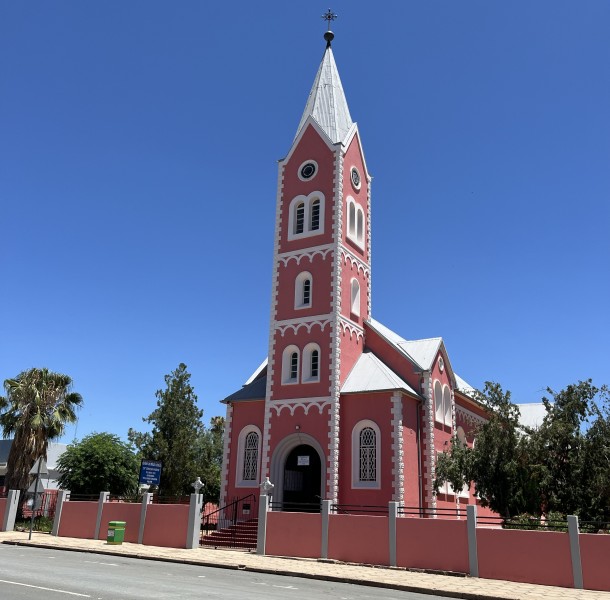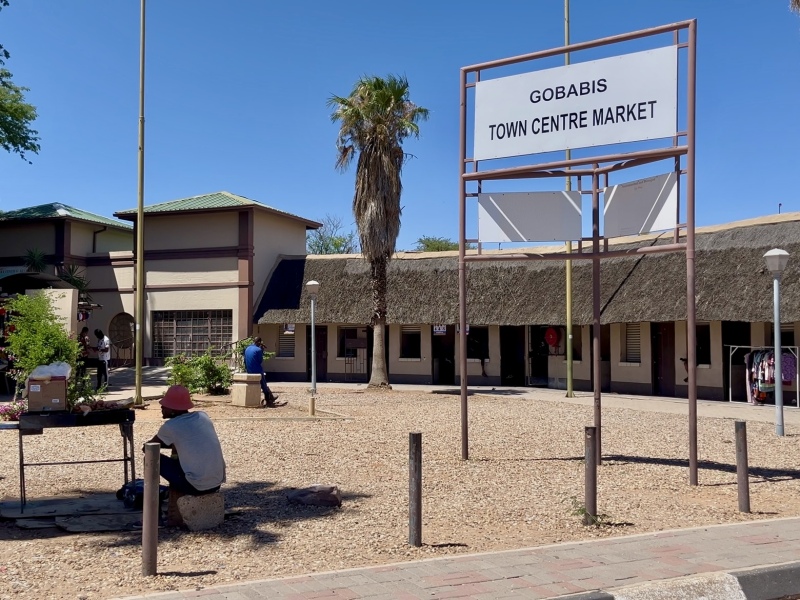 Wir fahren los. Die Schlaglöcher halten sich in Grenzen. Vor Gobabis wählen wir die Strasse durchs Zentrum und machen einen ersten Halt beim Town Centre Market. Da finden wir einige Stände vor, wo allerlei Waren angeboten werden: Früchte, Gemüse, Kleider u.s.w. Was uns aber unangenehm auffällt, sind die vielen bettelnden Kinder, vorwiegend Knaben, die sehr ausdauernd und aufdringlich von uns „Money“ fordern. Wir besteigen sehr schnell wieder unser Auto und fahren der Church Street entlang zur evangelischen Kirche. Beim Einkaufszenrum vis-à-vis ist ein riesiger Parkplatz, wo wir unseren Wagen abstellen können. Die Kirche steht in einem gepflegten, umzäunten Park, dessen Eingänge aber alle geschlossen sind. Ein Coffee-Shop in der Nähe lädt zu einem kühlen Getränk ein, denn unterdessen ist es heiss geworden. Der Laden entpuppt sich als Gemischtwaren-Geschäft, das neben ein paar Gästetischen, teilweise in einer vom Trottoir abgetrennten Zone im Freien, Frauenkleider, Haushaltartikel und vieles mehr anbietet. Wir geniessen im Aussenbereich ein Getränk, und die äusserst umtriebige Geschäftsführerin möchte Mila noch ein Bustier verkaufen. Allerdings beschliessen dann meine Begleiterinnen, für jeden der drei Haushalte einen Straussenfederwedel zu kaufen, den dann ihre Männer zuhause zum Abstauben verwenden können. Ob diese den Transport und danach die Zollkontrolle überstehen, das steht noch in den Sternen.