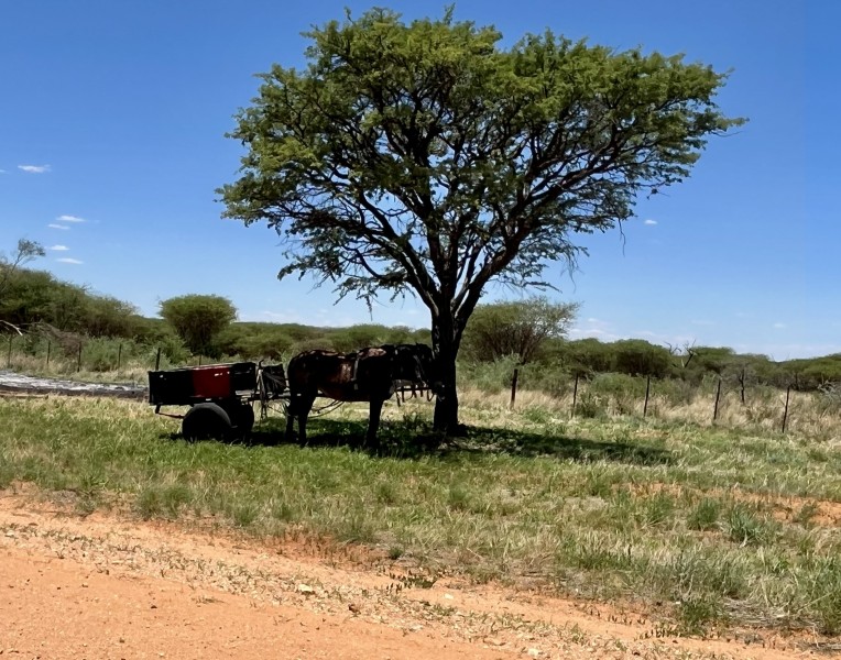 Nun gelangen wir auf eine offenbar selten befahrene Strasse, die ein paar km weiter wieder zur A 3 führt. Wir kommen zügig vorwärts, da diese asphaltiert ist und wenig Schäden aufweist. An der Distriktgrenze kommen wir zu einer Stelle, wo alle Fahrzeuge angehalten werden, damit sie und die Insassen desinfiziert werden können. Das geht folgendermassen: Jede Person muss mit den Schuhen in eine Wanne hineintreten, in der sich eine mit einem scharfen Desinfektionsmittel getränkte Matte befindet. Die Reifen des Fahrzeugs werden von einer Amtsperson damit abgesprüht. So soll verhindert werden, dass sich Tierseuchen im Land ausbreiten. Solche Posten findet man öfters. Da kann es auch sein, dass das Fahrzeug durch eine grosse Wanne mit dem Desinfektiosmittel fahren muss. Beim Grenzübertritt von Namibia nach Botswana mussten wir zudem alle Schuhe im Gepäck desinfizieren.